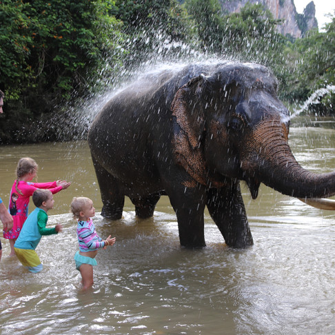 After his dinner Somboon strolled down to the river for a bath and we got to go and help wash him… not that our little splashes did much good compared to his trunk loads of water. Besides being enormous and gentle, the most impressive thing about it was the relationship between Somboon and his caretaker. There was no poking or prodding just conversation and cooperation. You could tell Somboon was listening and knew he could trust him.